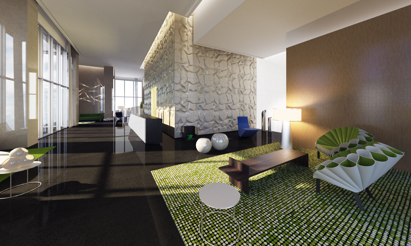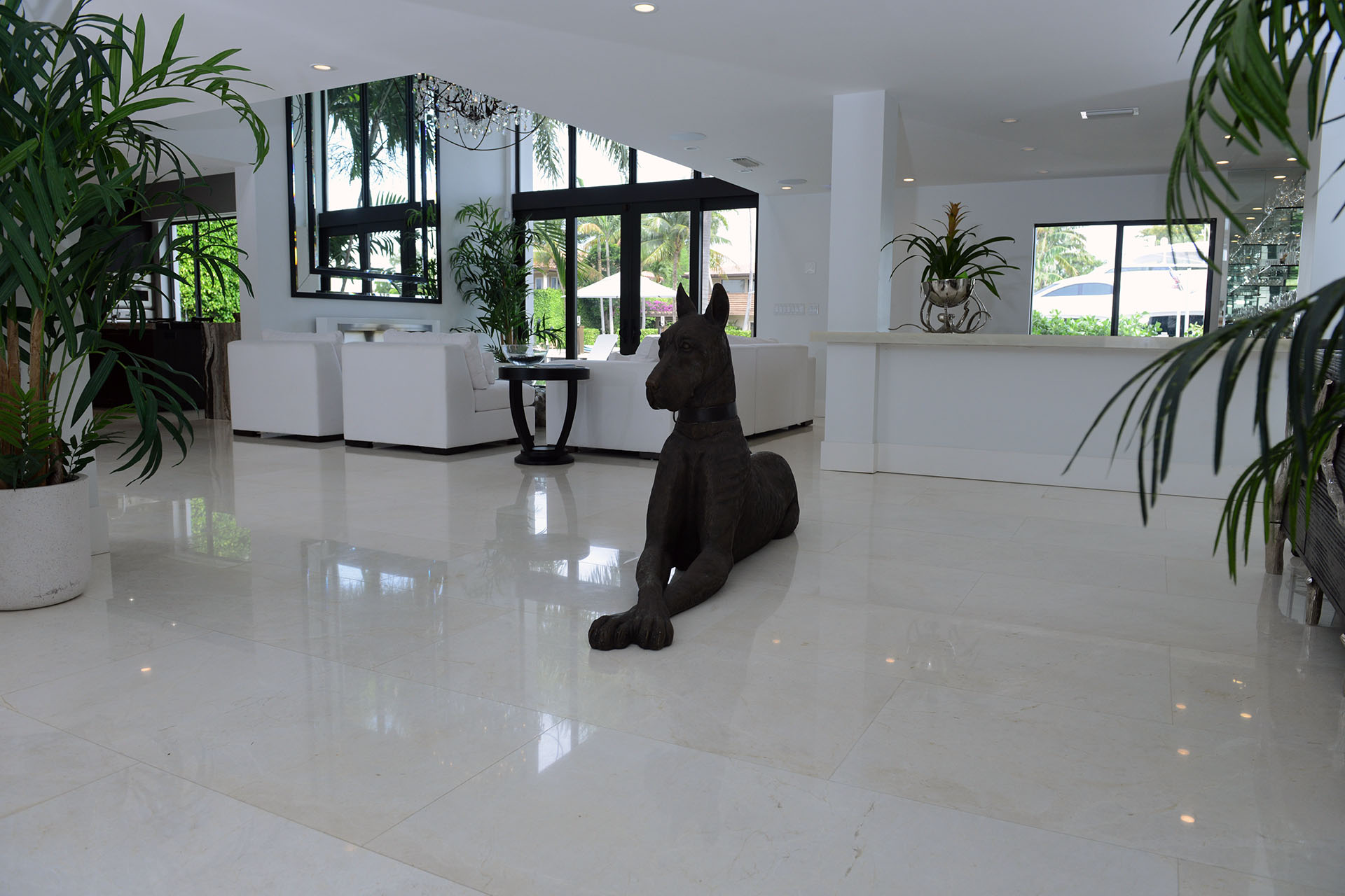 Le sol en marbre poli offre une toile de fond parfaite à la décoration intérieure de l'espace en utilisant le contraste des couleurs et de l'échelle.