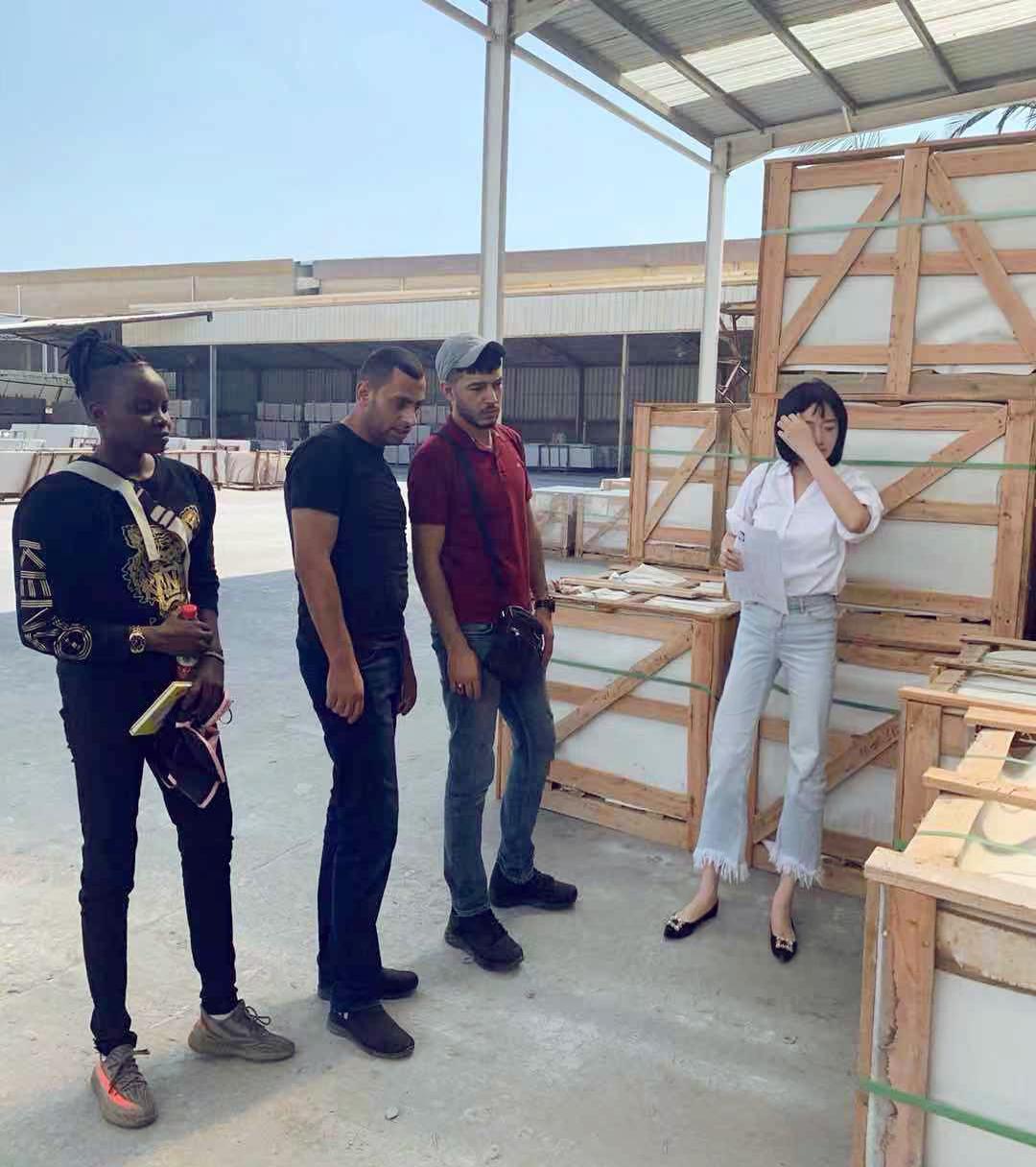 Le 15 septembre, M. Mohammed RA Alatrash et M. Mohanad MM Abualfilat d'une société palestinienne LAPERLA INVESTMENT CO. sont venus à Xiamen pour vérifier leurs marchandises fabriquées dans notre société, notamment les comptoirs, les marches et les contremarches G664.